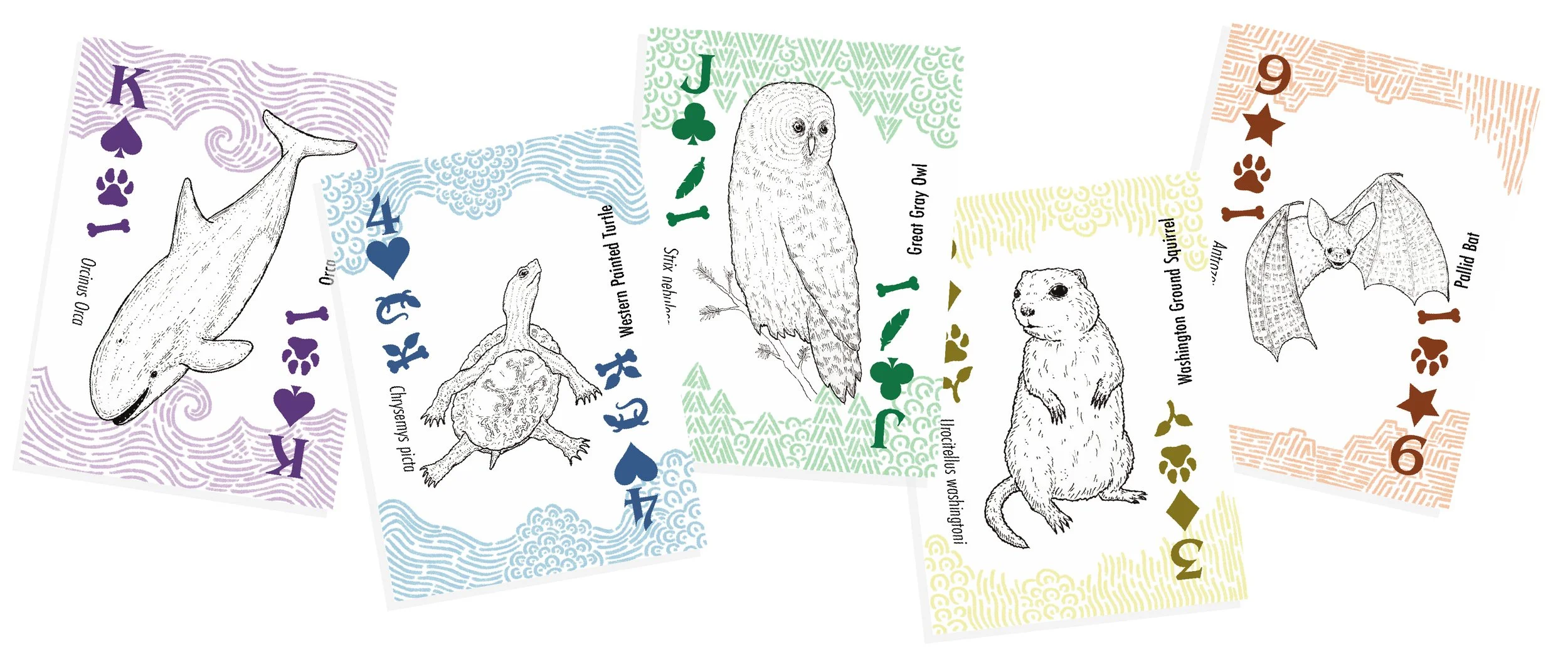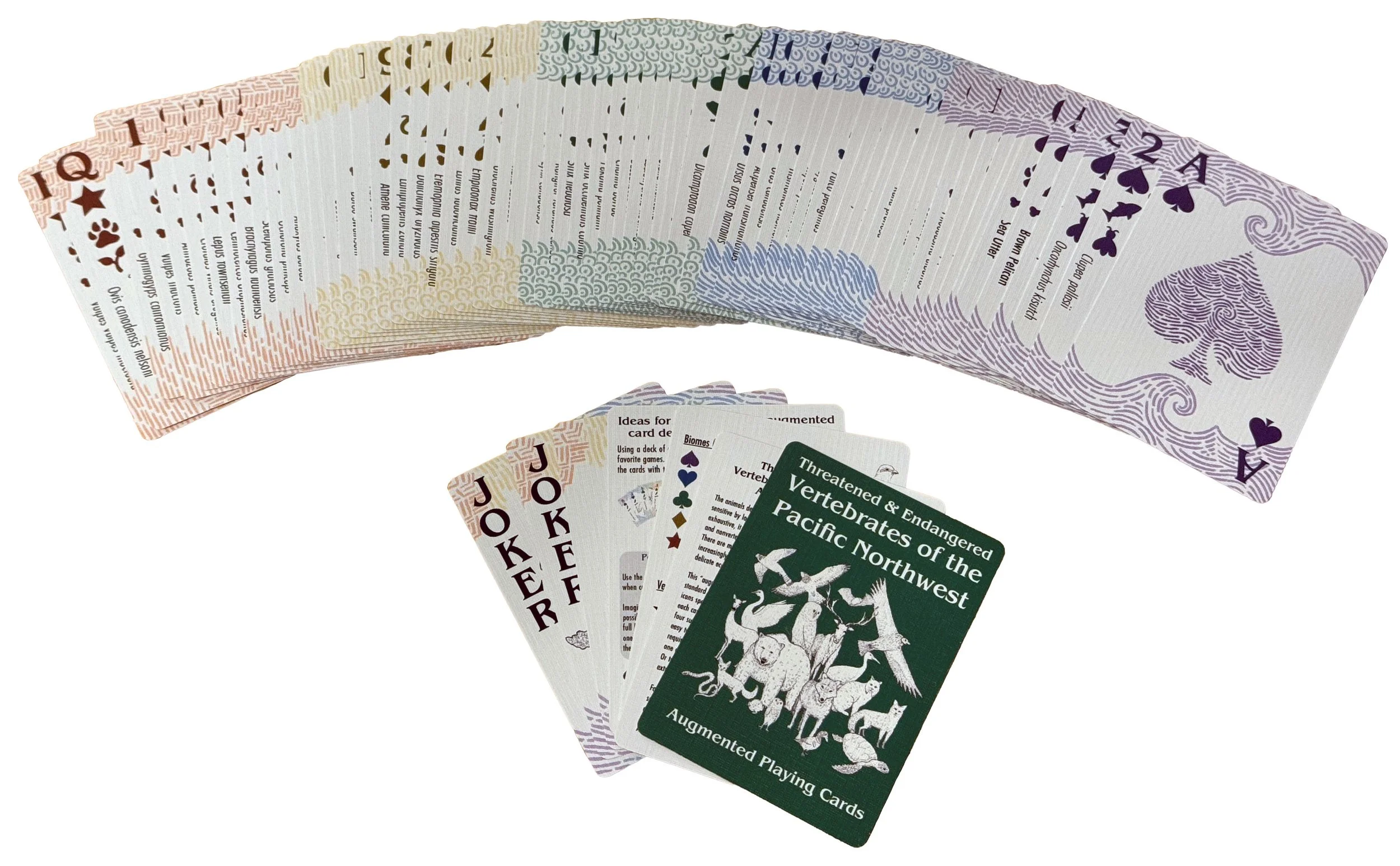 Many of the animals depicted in this deck are classified as endangered or threatened by local government agencies. Some are not classified yet, but are of concern. The list of animals in this deck is not exhaustive, it is a select few representatives of the many animals listed as endangered or threatened across the Pacific Northwest.