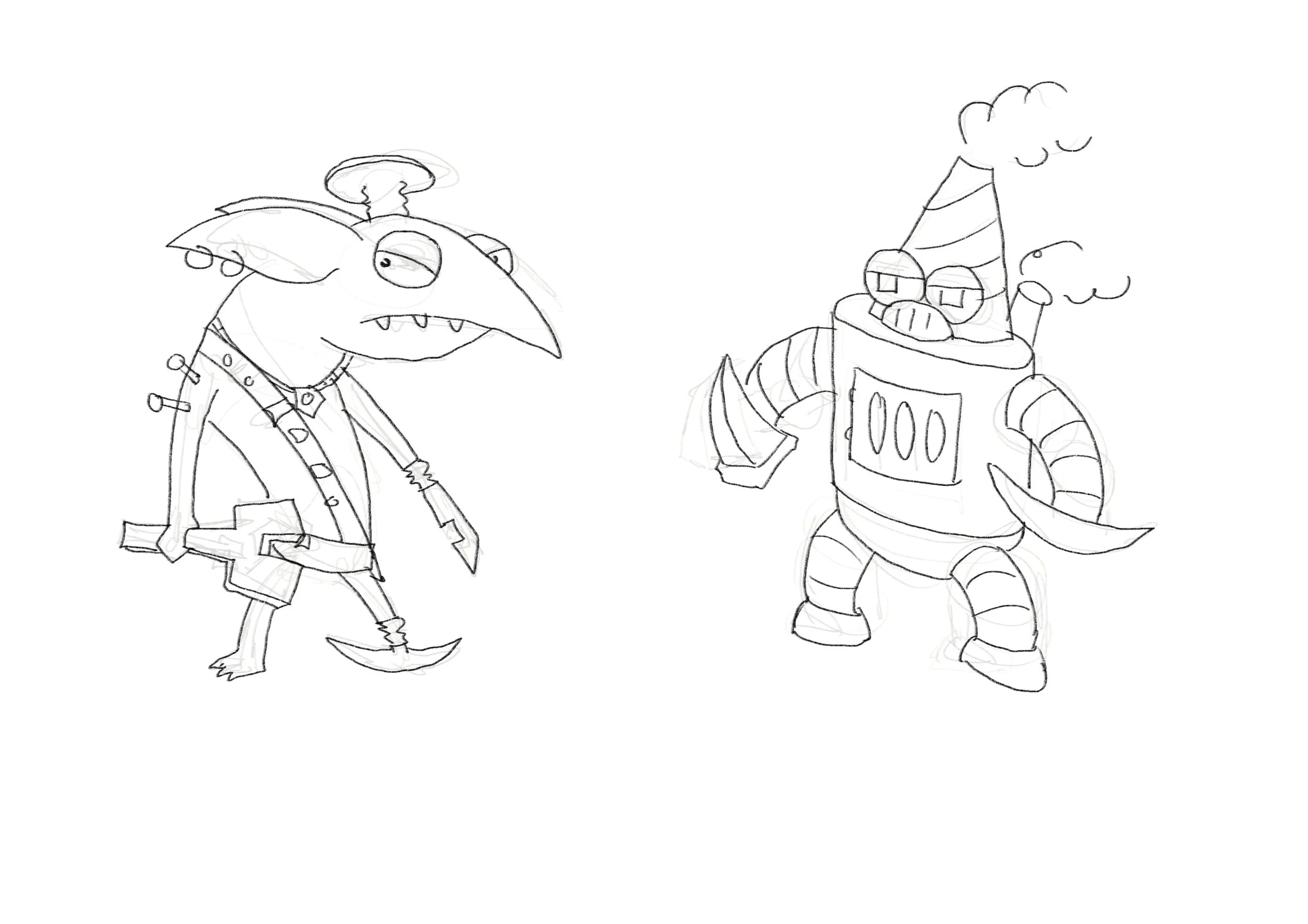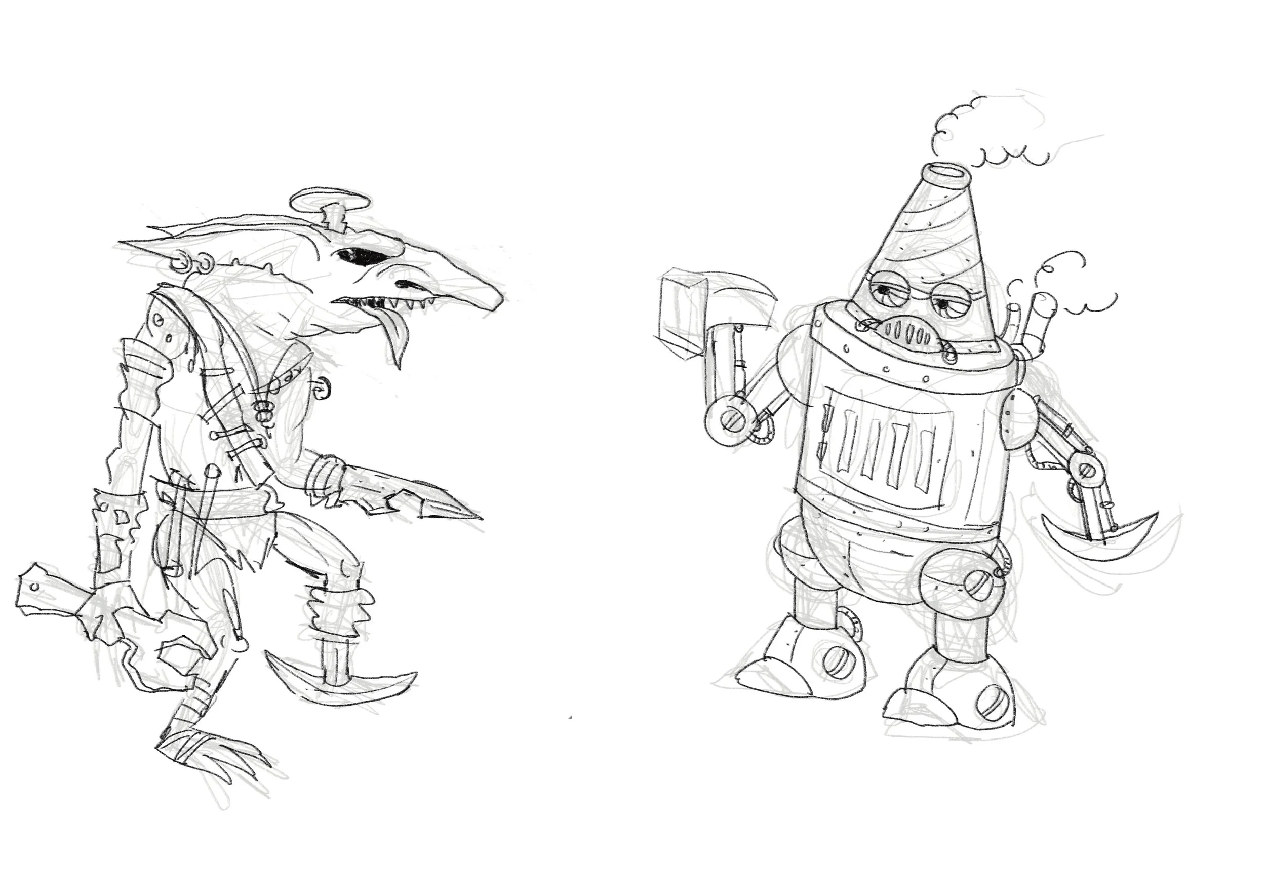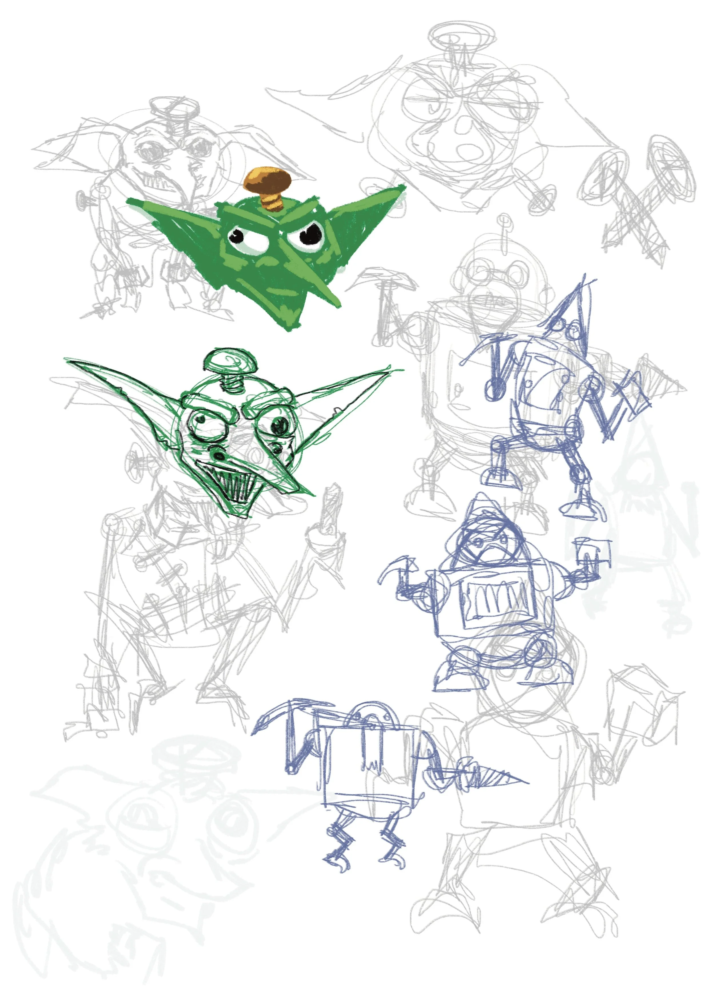 Brainstorming & concept drawings for character designs for a Personal Board Game Project “Gnomebots & Knoblins”